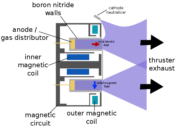 hall effect thruster은 이온 엔진 종류 중 하나임. 전에 쓴 Gridded ion thruster과 비교해보면 비추력은 더 낮지만, 추력은 더 높음.