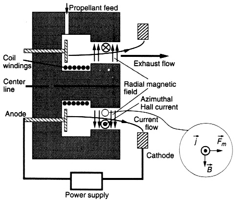 일단 쿨롱 힘으로 이온을 가속하는 건 Gridded ion thruster과 같지만, 대전된 격자 대신 전자를 직접 사용해서 가속함. 도넛 모양 전자석이 0.01~0.03T의 자기장을 걸어주면 음극에서 나온 전자가 양극에 도달하지 못하고 잡힘. 그럼 홀 효과 때문에 전자가 엔진 내부를 돌면서 홀 전압을 발생시킴.